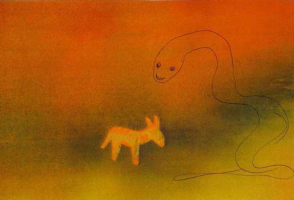 Kurz darauf erscheint Lilly noch einmal: "Ismael, ich glaube, Du bist jetzt zu manchem bereit. Weißt Du was? Ich zeige Dir ein Land der Freiheit. Manchen war die immer das wichtigste von allem, ohne Wenn und Aber. Dorthin zu kommen, ist nicht leicht. - Wir können aber einen Trick anwenden: Ich verschlucke Dich sanft und zärtlich und so transportiere ich uns durch einen Tunnel dorthin." |