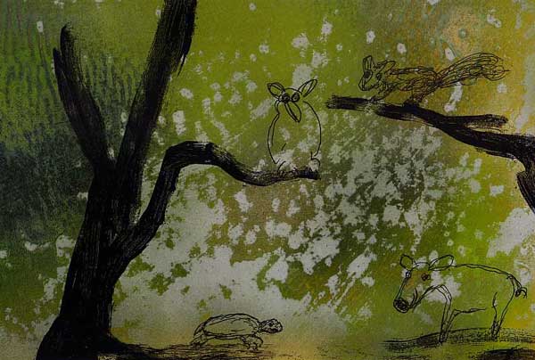 Plötzlich kommt ein Sturmtief auf, das die Elemente durcheinanderwirbelt. Da erscheinen vier prophetische Tiere mitten im Unwetter: |